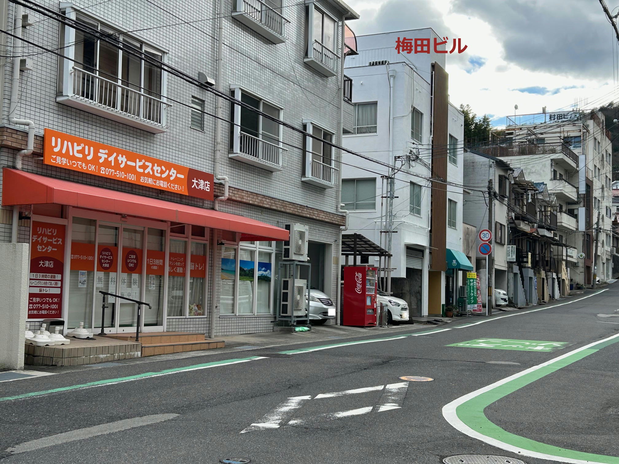 リハビリデイサービスセンター(旧Let’s倶楽部。左上写真のオレンジのテント/オーニングが目印)隣。大津駅から徒歩約5分。